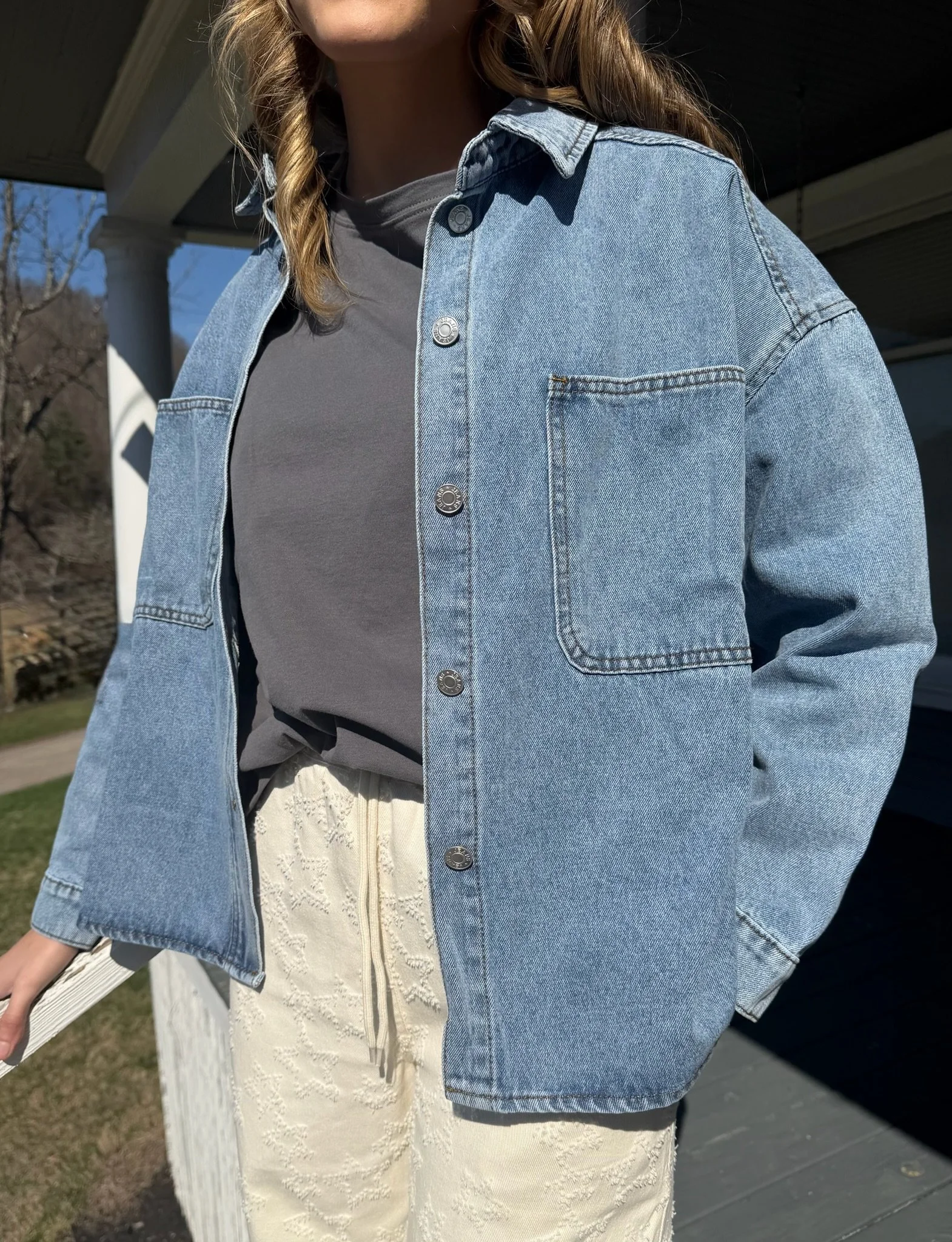 Elevate your casual wardrobe with this effortlessly cool washed denim shirt jacket. Designed with a relaxed, loose fit, this versatile piece features classic button-down styling, large front patch pockets, and dropped shoulders for a laid-back vibe. 100% cotton